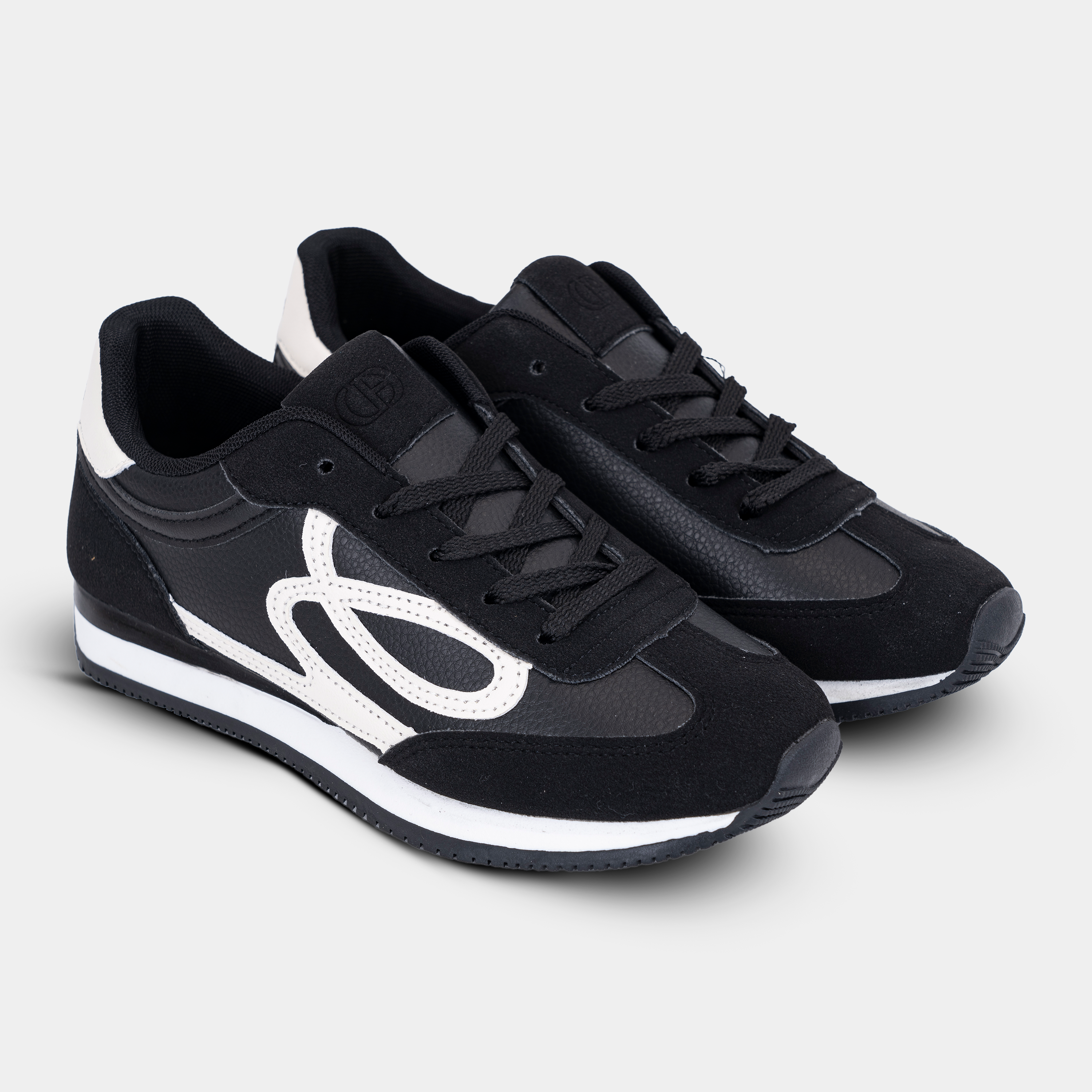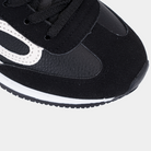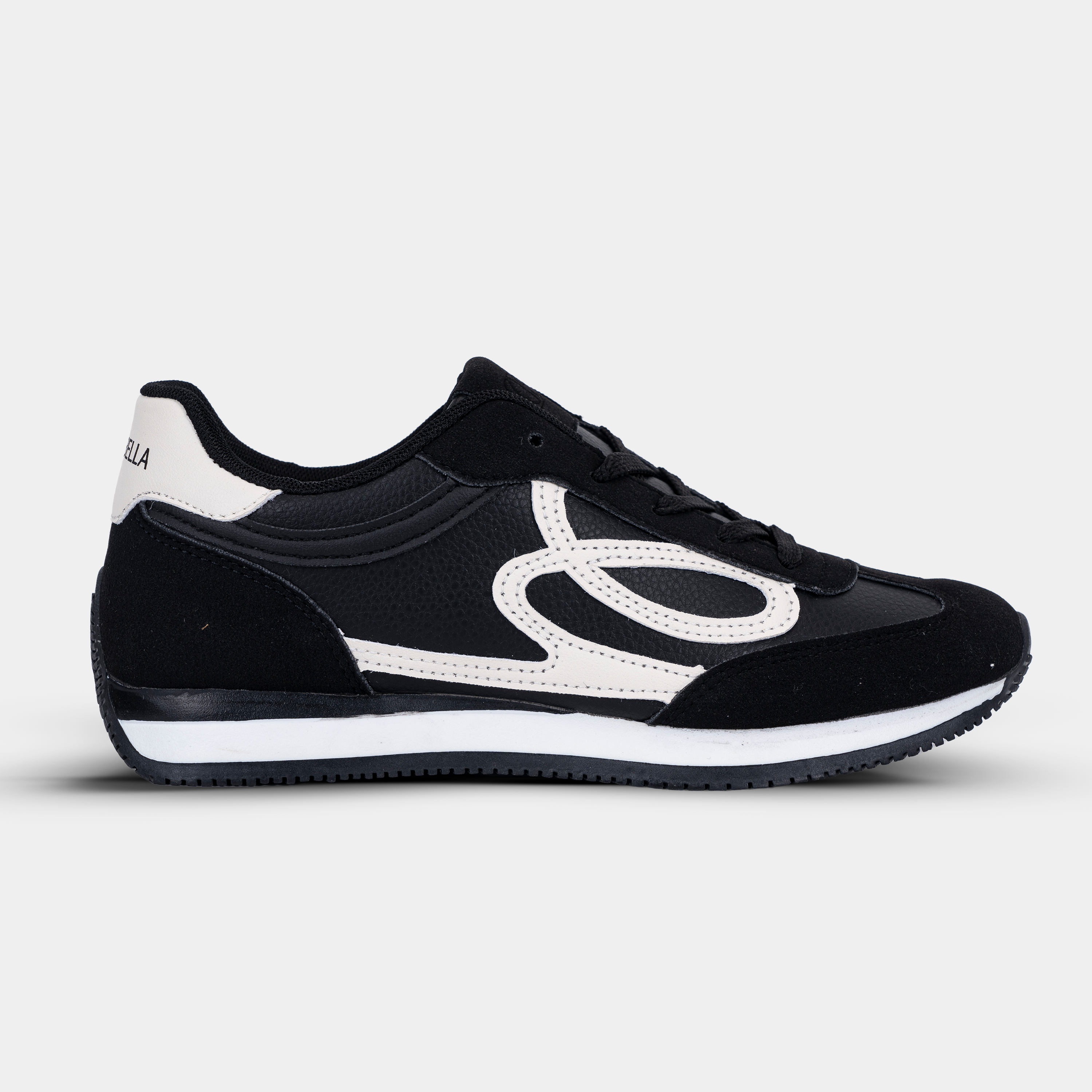 كوتشي أسود كلاسيكي بتصميم عصري، مزين بنقوش بيضاء جريئة تضيف لمسة مميزة. حذاء مسطّح مريح يناسب جميع خطوات يومك في السعودية.