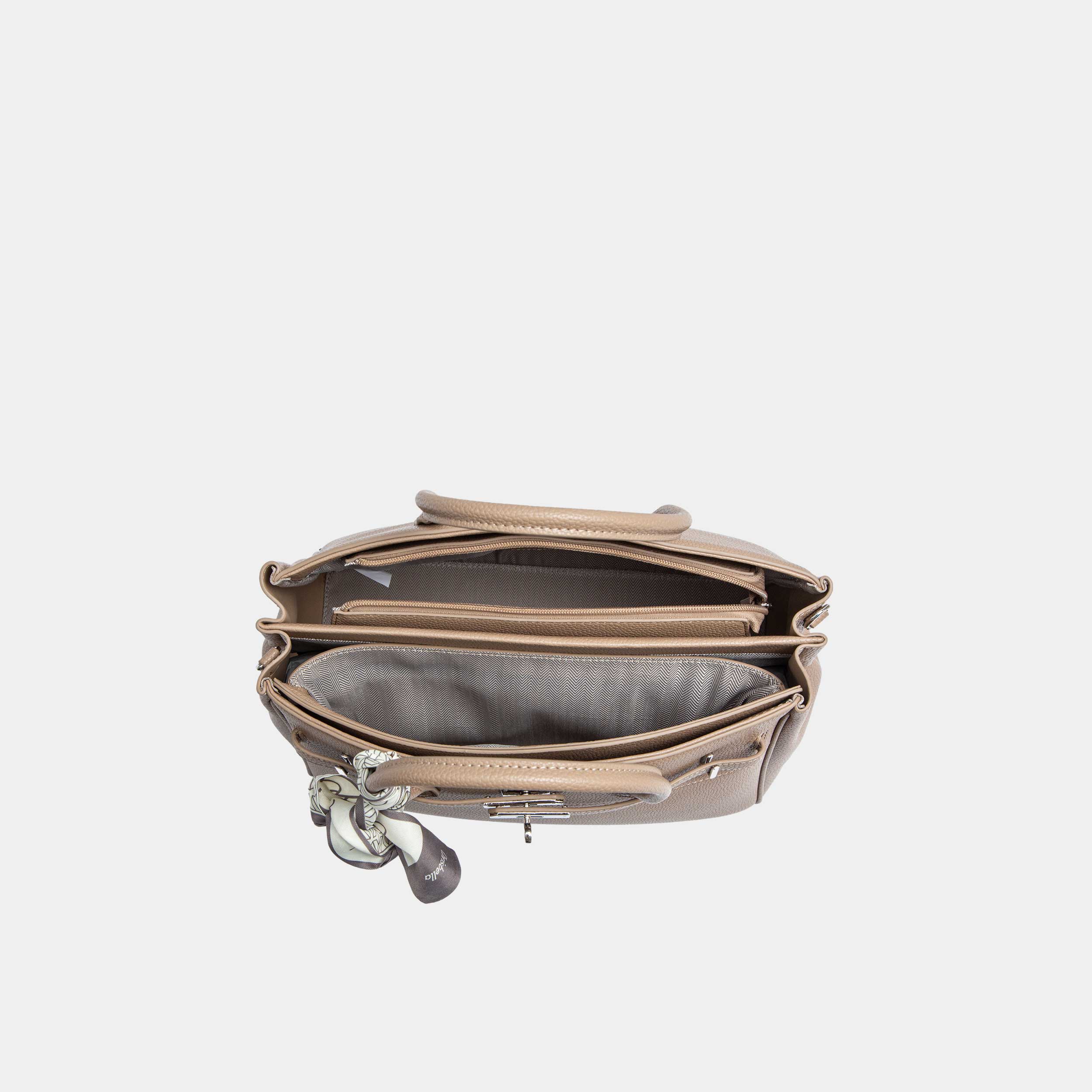 - يمكنك إغلاقها بسهولة باستخدام قلاب الإغلاق الأمامي المصمم بشكل جذاب. وعند فتحه ستجد داخل الحقيبة جزءًا مبطنًا بالقماش النمري.