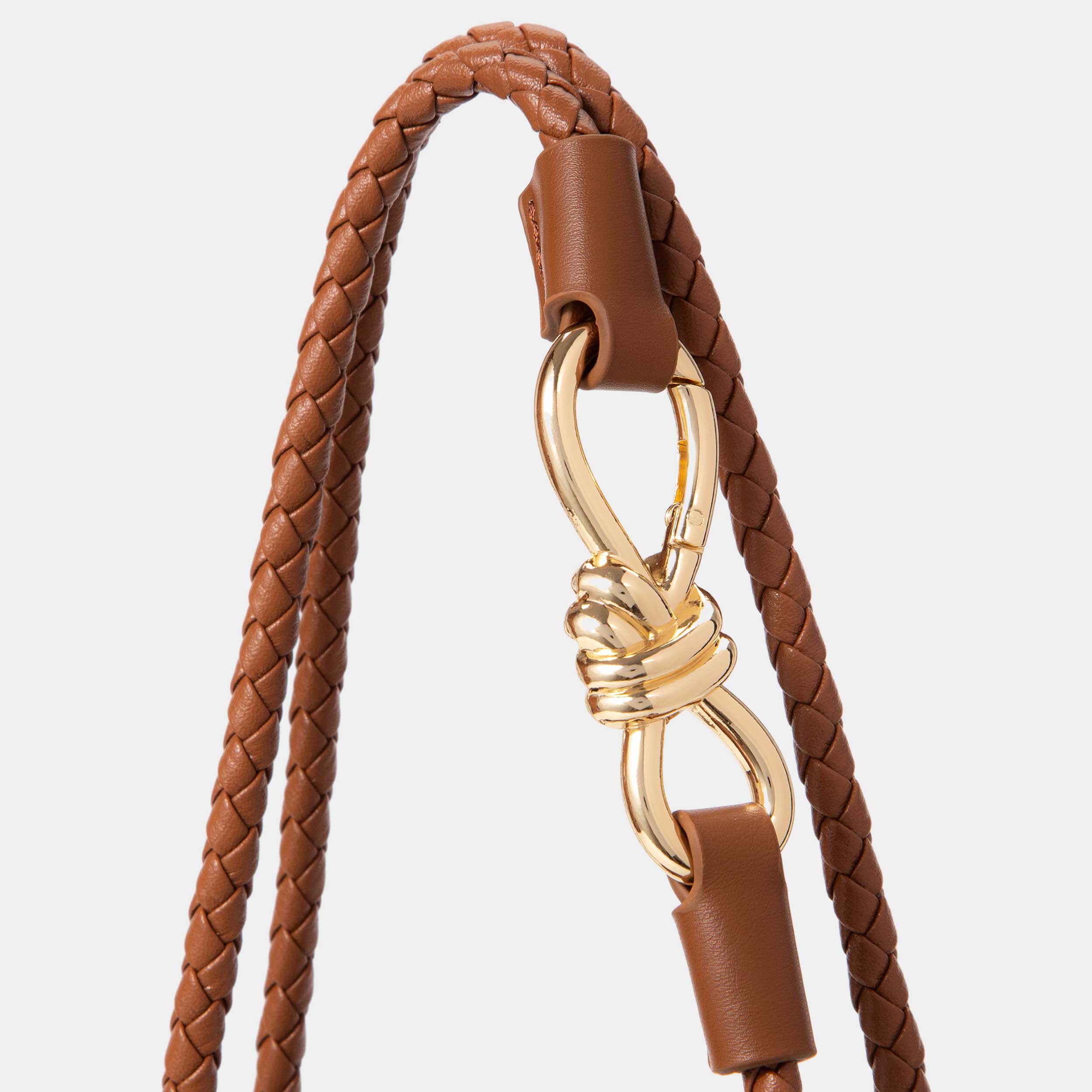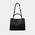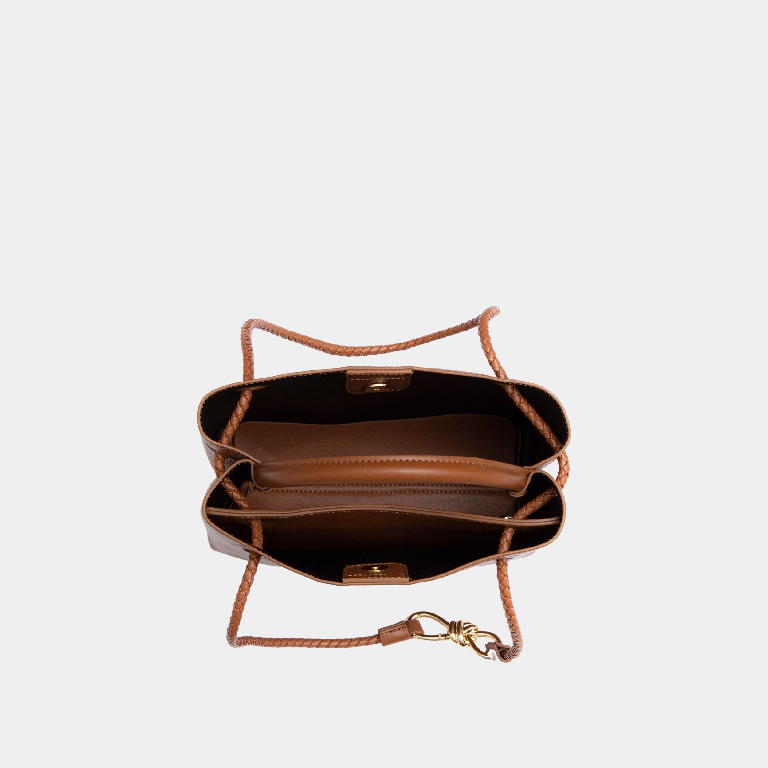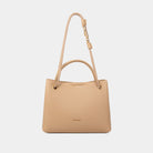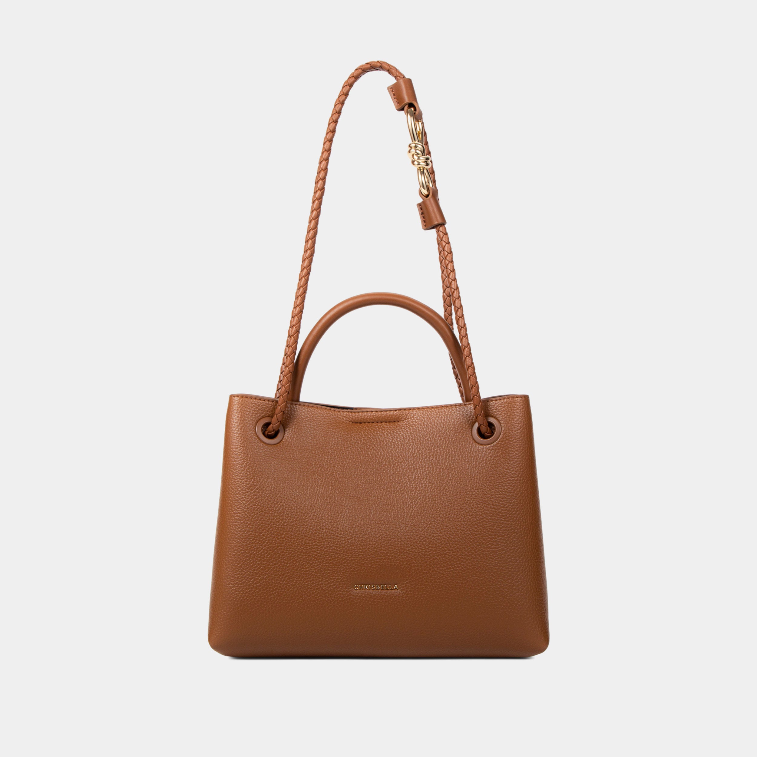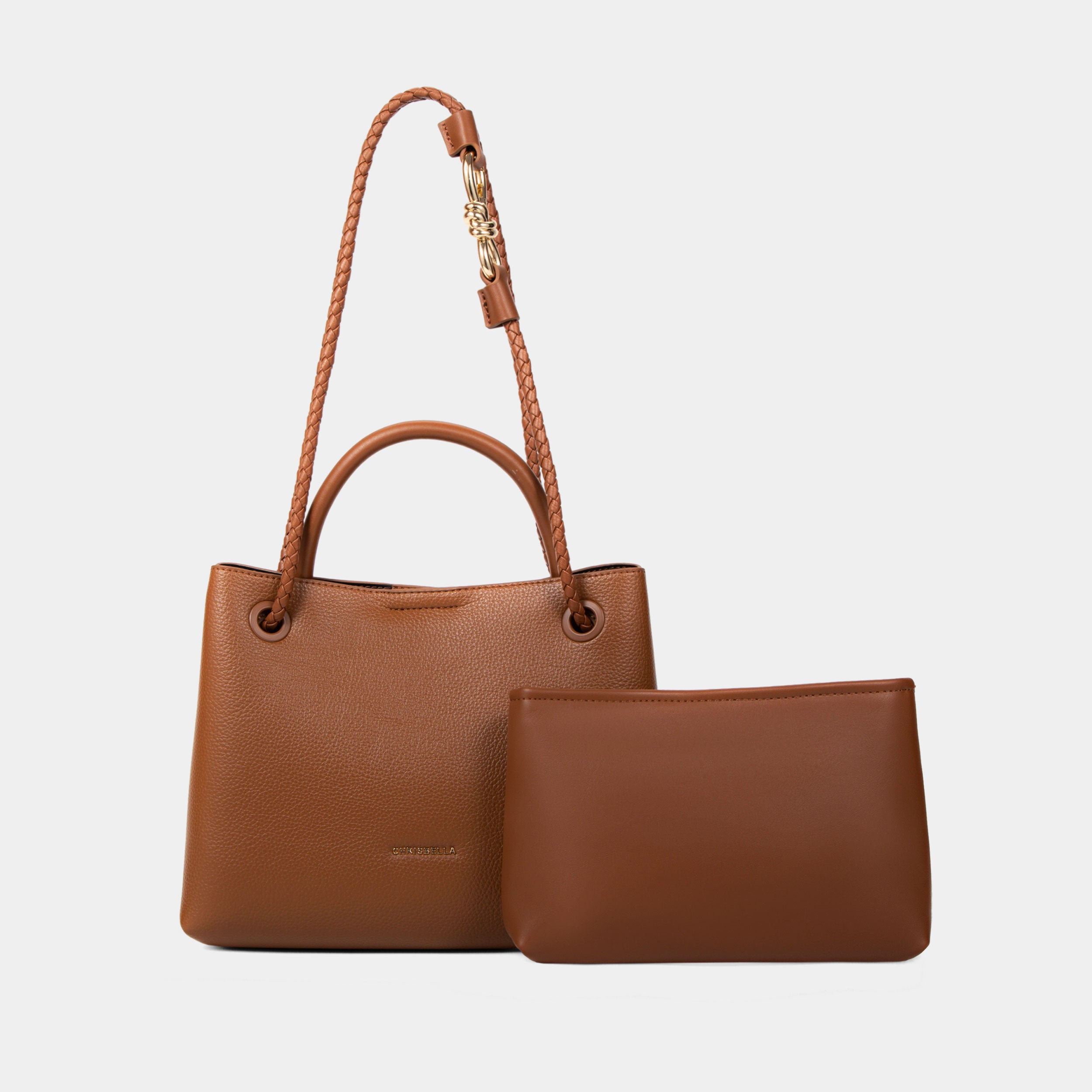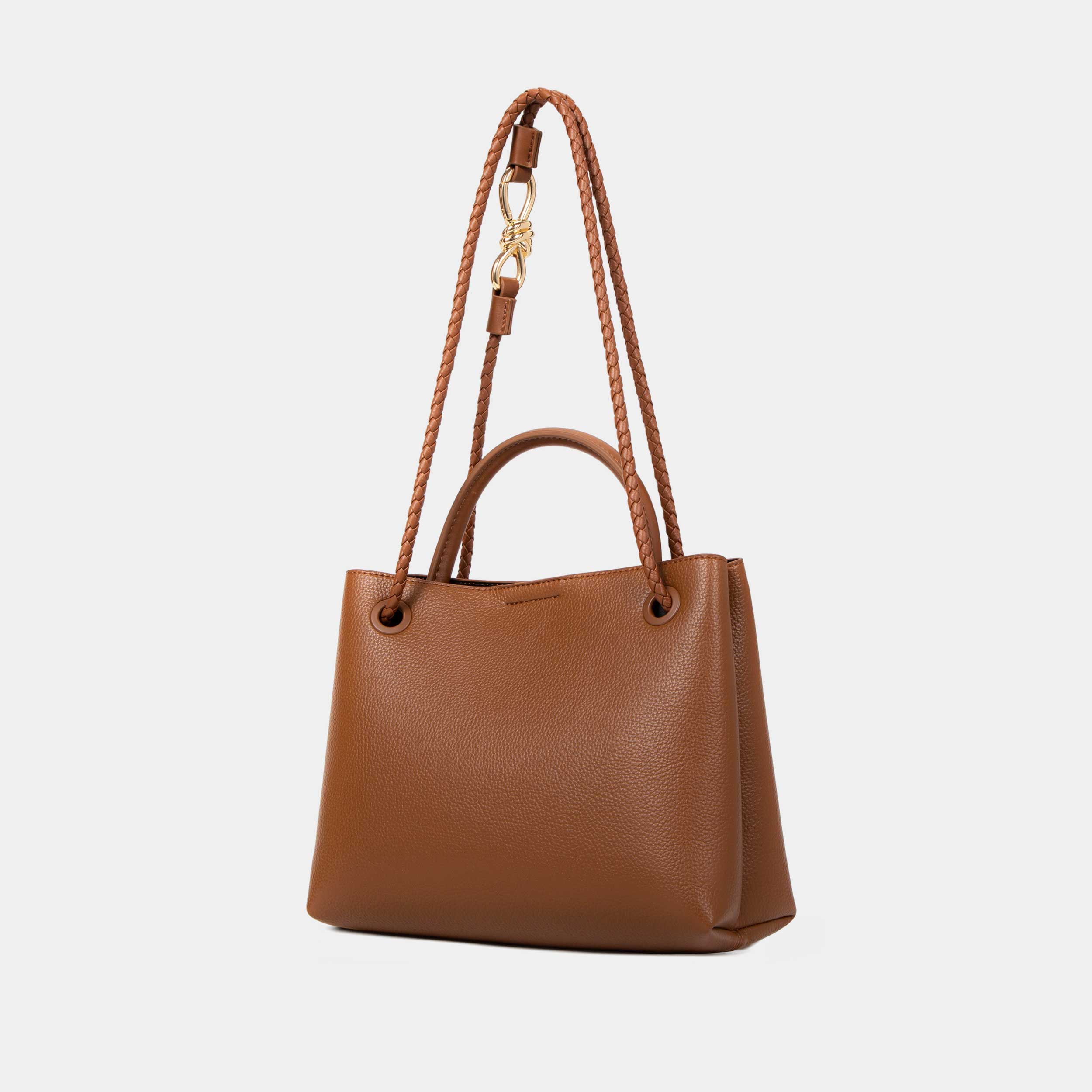 تتميز بتصميم أنيق ومتعدد الاستخدامات مع بنية من الجلد المتداخل، تفاصيل معدنية باللون الذهبي، مقبض علوي مثبت، حزام كروس، قسم داخلي عملي مع جيب بسحّاب وجيبين مفتوحين.