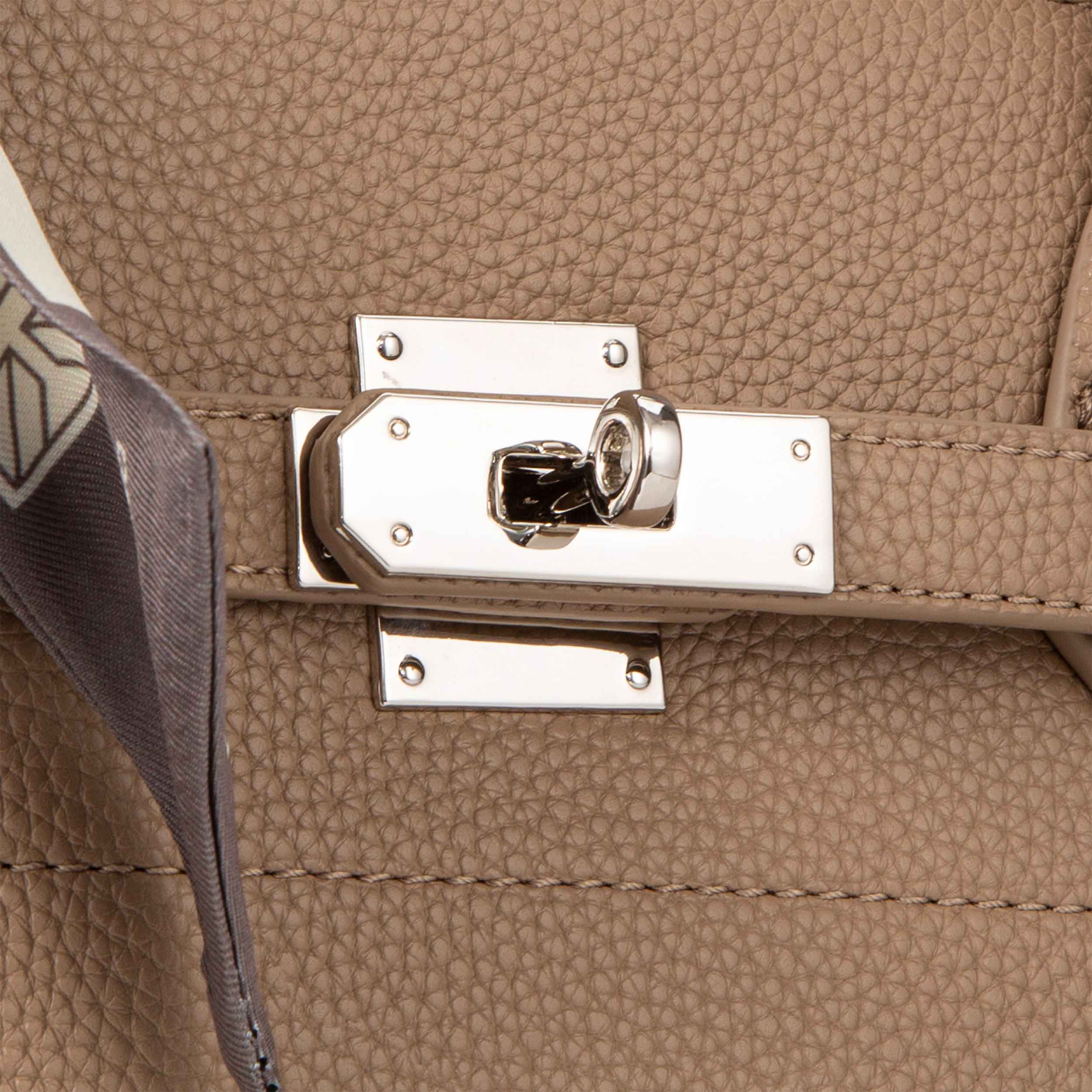 • يمكنك إغلاقها بسهولة باستخدام قلاب الإغلاق الأمامي المصمم بشكل جذاب. وعند فتحه ستجد داخل الحقيبة جزءًا مبطنًا بالقماش النمري.